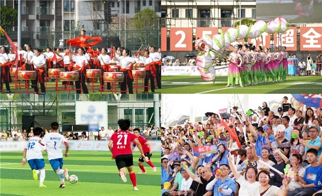 开幕式上,百人的大鼓齐鸣,震撼开场,瞬间点燃了现场氛围。“桃子龙”腾跃翻飞、“莲宵舞”舞步翩跹,轮番登场的非遗文化展演,生动演绎了射洪独特地域文化魅力。更有贵州村超非遗天团空降助阵,为现场观众带来一场独具特色的文化盛宴。活动当晚,射洪与榕江足球代表队开展了交流赛,球员们在绿茵场上奔跑拼抢,引来了观众的阵阵欢呼,将现场氛围推向高潮。