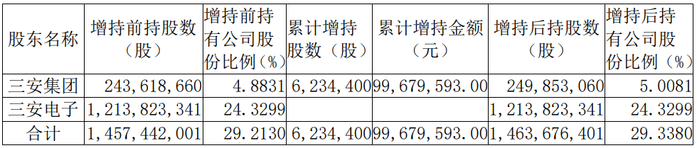 本次增持完成后,三安集团持有三安光电的股权比例上升至5.0081%,三安集团和三安电子合计的持股比例则上升至29.338%。