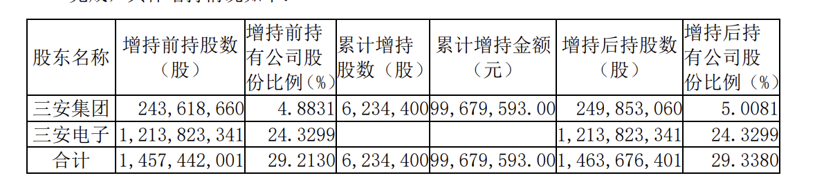 本次增持之后,三安电子及三安集团合计持有本公司股份数量为14.64亿股,占公司总股本比例为29.34%。