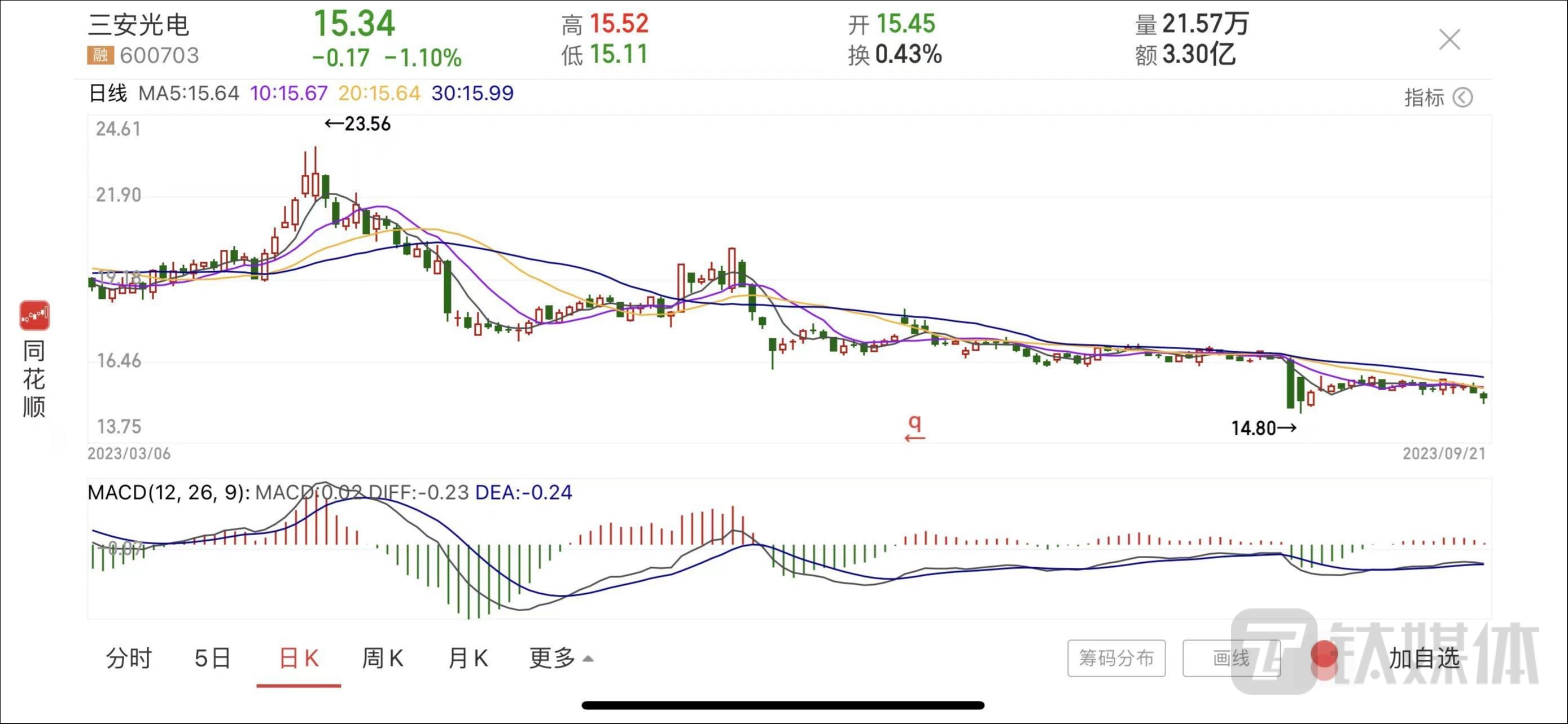 经计算,三安集团增资均价为15.99元。从三安光电近半年股价走势来看,整体呈现下行趋势,已从4月初的最高点(23.56元)回落至16元以下。截至9月21日收盘,三安光电股价报收15.34元,跌幅1.1%,当前公司总市值约765.3亿元。