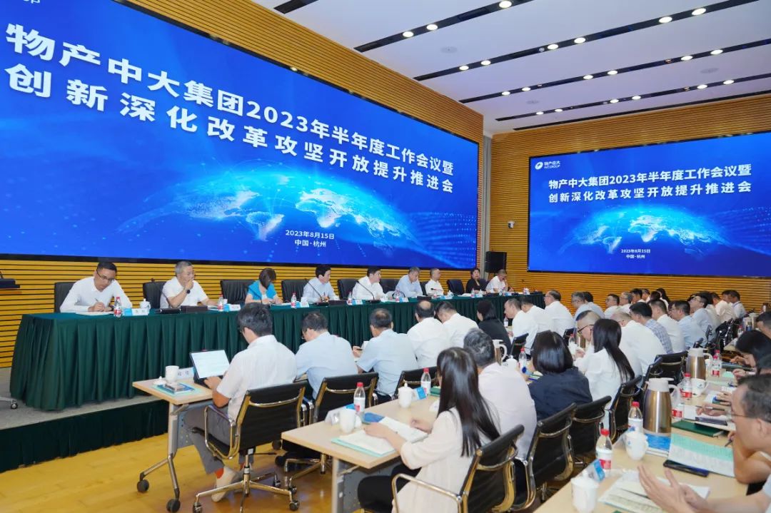 8月15日上午,物产中大集团召开2023年半年度工作会议暨创新深化改革攻坚开放提升推进会,传达学习省属企业负责人会议暨加快建设世界一流企业推进会精神,总结上半年工作情况,分析当前面临形势和存在问题,谋划部署下半年重点任务,动员集团各级单位和干部员工把握新形势、落实新任务、应对新挑战,坚定不移完成全年目标任务。集团领导班子出席会议,董事长、党委书记陈新作主题讲话,总裁、董事、党委副书记宋宏炯主持会议。