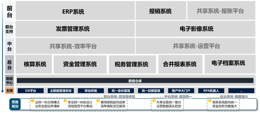 后台系统稳固:将核算系统控制在“1+3”范围内,在集团层面统一核算标准。统建资金系统、税务系统,各业务系统与资金系统与税务系统对接,实现直连支付及资金管理、直连开票、自动认证及税务管理等,通过集团统建,打造稳固强大的后台功能。