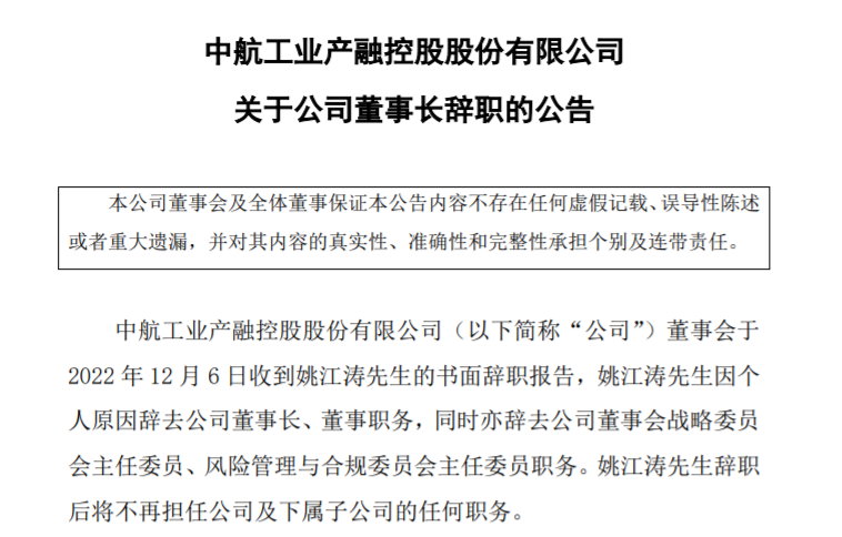 12月6日午后,中航工业产融控股股份有限公司(简称“中航产融”)发布公告称,公司董事会于2022年12月6日收到姚江涛先生的书面辞职报告,姚江涛先生因个人原因辞去公司董事长、董事职务,同时亦辞去公司董事会战略委员会主任委员、风险管理与合规委员会主任委员职务。姚江涛先生辞职后将不再担任公司及下属子公司的任何职务。