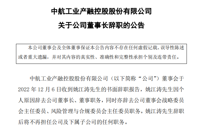 12月7日,中航产融发布《关于公司董事长辞职的公告》。公告称,中航产融董事会于2022 年12月6日收到姚江涛先生的书面辞职报告,姚江涛先生因个人原因辞去公司董事长、董事职务,同时亦辞去公司董事会战略委员会主任委员、风险管理与合规委员会主任委员职务。姚江涛先生辞职后将不再担任公司及下属子公司的任何职务。