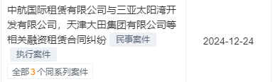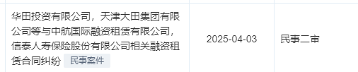 除了此前16.09亿的债权纠纷,华田投资还把持有的奥凯航空1.2亿股权抵押给了中航租赁。今年四月,华田投资与中航租赁、信泰人寿,还有融资租赁合同纠纷。中航租赁与华田投资的前股东天津大田及关联方三亚太阳湾,也有融资租赁纠纷。