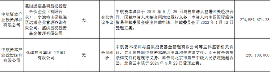 中航产融旗下子公司中航资本产业投资深圳(中航产投)起诉:芜湖远福昌明、宁波远澈、盛洪股权基金,起因是:合伙协议争议,纠纷金额为2.74亿元。