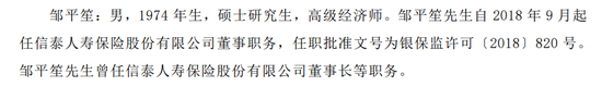 邹平笙的公开信息不多,仅有的信息目前来自信泰人寿的公告,只知他是1974年生,高级经济师,