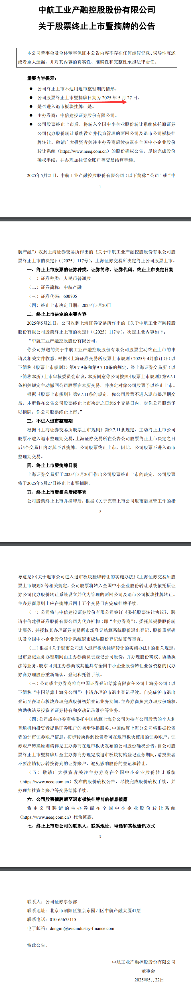 2025年5月22日晚间,中航产融发布“关于股票终止上市暨摘牌的公告”,根据该公告显示,2025年5月21日,中航工业产融控股股份有限公司(以下简称“公司”或“中航产融”)收到上海证券交易所作出的《关于中航工业产融控股股份有限公司股票终止上市的决定》(〔2025〕117号),上海证券交易所决定终止公司股票上市。