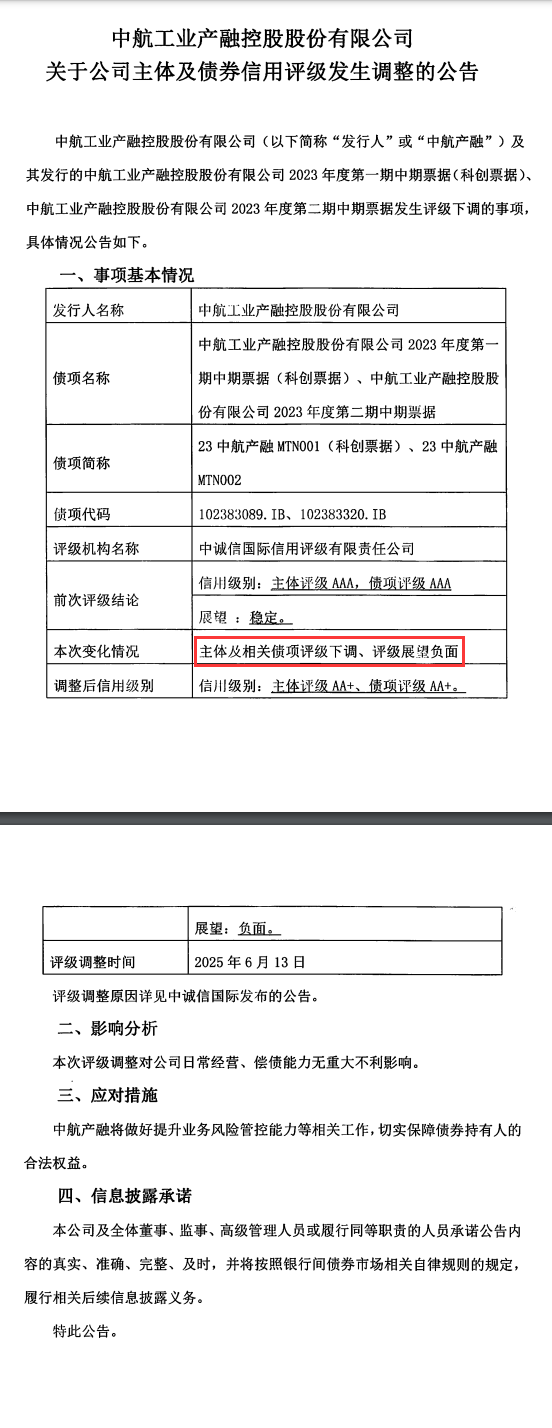 中航产融主体及相关债项评级下调 评级展望负面!