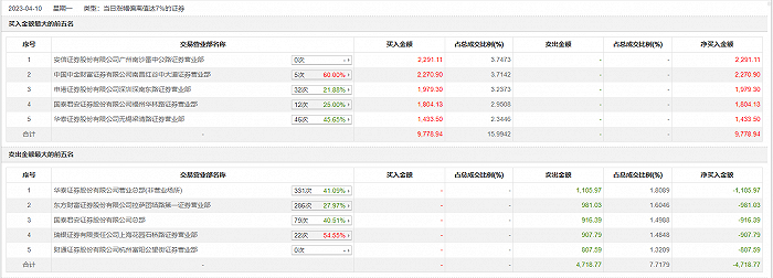 具体来看,安信证券广州南沙番中公路证券营业部、中国中金财富证券有限公司南昌红谷中大道证券营业部分别买入2291.11万元、2270.90万元;华泰证券总部、东方财富证券拉萨团结路第一证券营业部分别卖出1105.97万元、981.03万元。