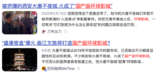 大唐不夜城有互动的盛唐蜜盒、迪士尼有互动的玲娜贝尔、环球影城中有互动的擎天柱,不少人称大唐不夜城是“中国版环球影城”,但钟晖和周海涛都指出,相比较成熟的迪士尼、环球影城等大IP主题乐园,大唐不夜城还差得很远。