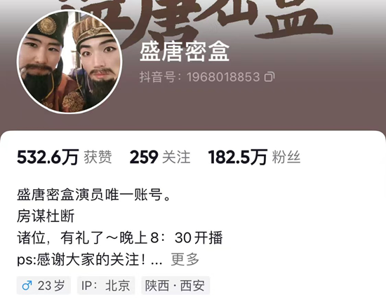 3月18日,“盛唐密盒”官方抖音账号发布了第一条视频,4月13日,该账号进行了一场直播,累计观看人数达到146.13万,人气峰值5.46万。截至目前,“盛唐密盒”抖音账号的粉丝数已经达到182.5万,获赞532.6万。