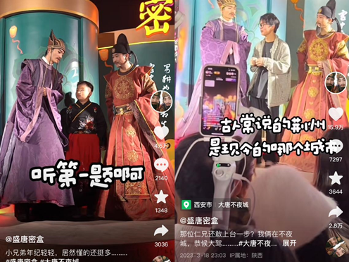 从形式上来看,盛唐蜜盒的名字与当下追求的“盲盒”有相似之处,节目形式新颖,答题过程简洁明了,还会赠送小礼品,抓住了观众的好奇心。从内容上来看,房大人和杜大人本身就是脱口秀演员,自带幽默感,临场反应能力佳,表演还融合了历史文化知识,用新颖方式来表达旧内容的方式更能吸引到游客的注意,既保证了文化传播的规律,也创新了传播的渠道和形式。