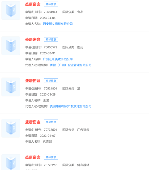 App数据显示,“盛唐密盒”被多方申请注册商标,申请人包括广州某美妆公司、山东某物业管理公司以及多个自然人,国际分类涉及广告销售、医药、健身器材等,当前商标状态多为申请中。