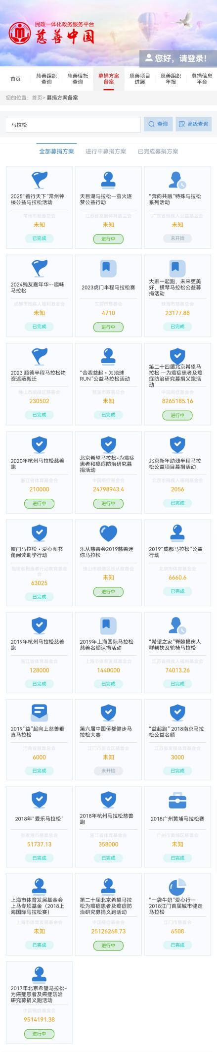 然而,记者在民政一体化政府服务平台“慈善中国”的公开募捐方案备案项目中搜索“马拉松”,显示公开募捐备案的马拉松中未有无锡马拉松。在无锡灵山慈善基金会的公开募捐方案中也未找到“马拉松”字眼。