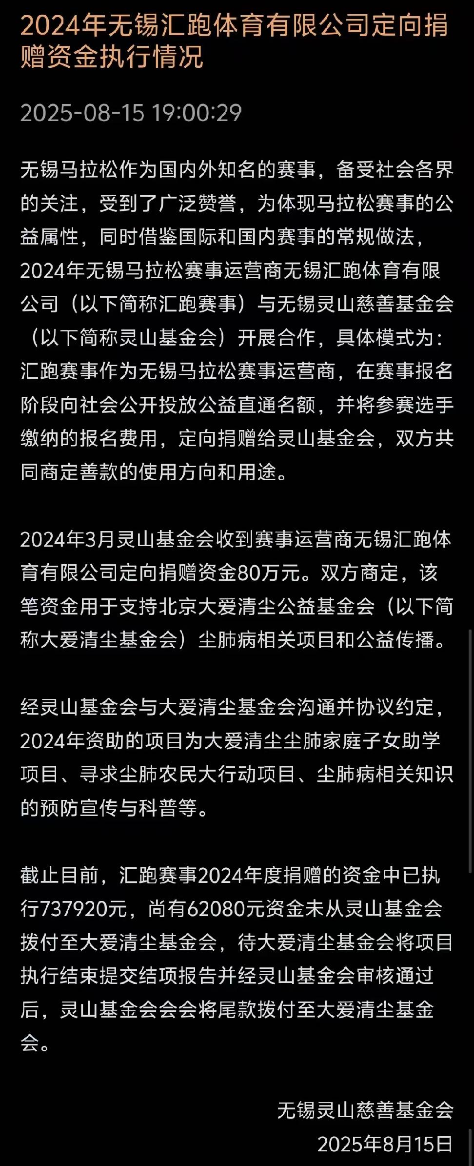 被媒体曝光马拉松赛事慈善跑善款去向成谜后,8月15日晚,灵山慈善基金会官网披露了2024年无锡马拉松慈善跑的资金使用情况。