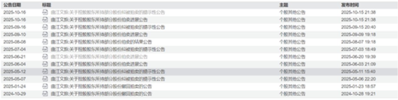10月15日晚间,曲江文旅(600706.SH)接连公告,其控股股东曲江旅游投资集团(简称“曲江旅投”)所持1221万股股份刚以1.01亿元拍出,紧随其后,另一笔占公司总股本4.06%的1035.82万股股份将于11月3日以8231万元起拍价再度开拍。