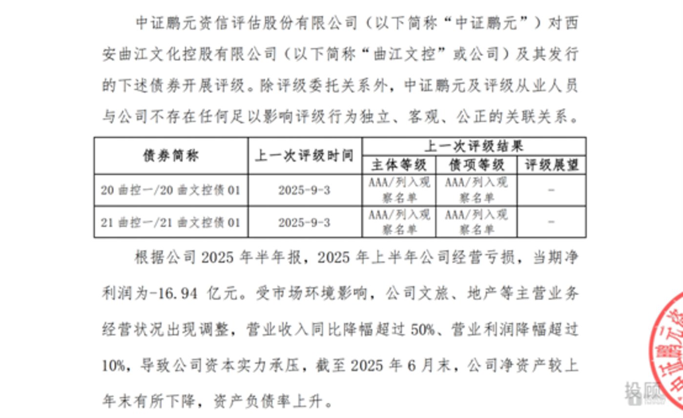 2025年10月13日,中证鹏元资信评估股份有限公司将21曲文控债01(2180301.IB)、21曲控一(152980.SH)的债项评级列入评级观察(走势不明),当前评级为AAA的西安曲江文化控股有限公司主体和债项评级目前均为AAA,同时被列入观察名单。