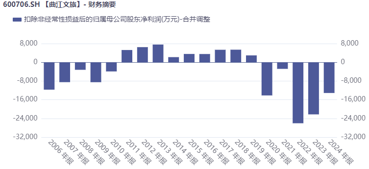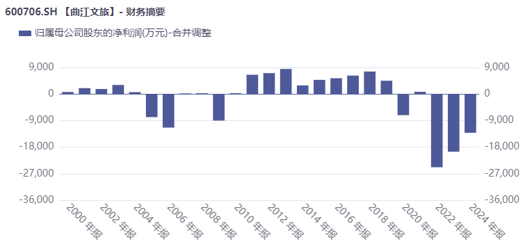 拥有顶级旅游资源,却没能转化为光鲜的业绩。值得注意的是,曲江文旅的业绩低迷尤其是净利亏损已经持续多年,财报显示,2020年至2024年,公司录得4个年度亏损,且2022年至2024年连续3年亏损,这3年累计亏损5.75亿元。如果算上2025年度的亏损,公司将连续4年亏损,4年亏损总额将超7亿元。