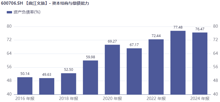 持续亏损给曲江文旅带来了资金周转的压力。而债务激增也考验公司的偿债能力和抗压能力,数据显示,近年来,公司的资产负债率长期在70%以上。2022至2024年,公司资产负债率分别为72.44%、77.48%、76.47%,2025年前三季度为76.61%。