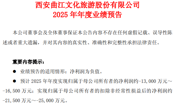 根据曲江文旅的预报,经财务部门初步测算,预计2025年公司实现归母净利润约-1.3亿元至-1.65亿元,扣非净利润约-2.15亿元至-2.50亿元。