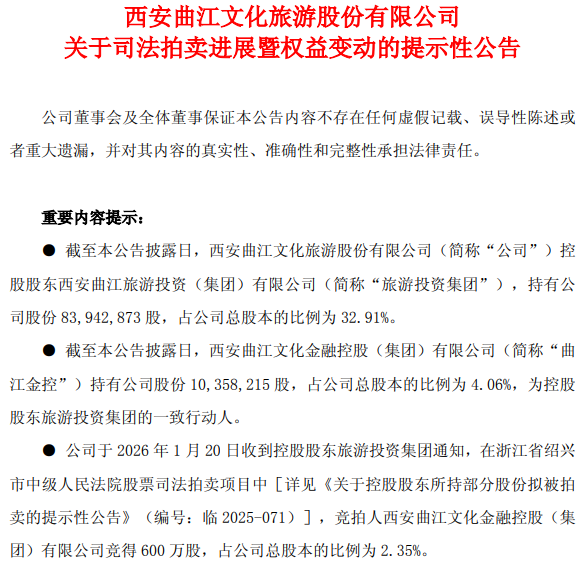 而根据公司最新公告,公司2026年1月20日收到控股股东西安曲江旅游投资集团通知,西安曲江文化金融控股(集团)有限公司在司法拍卖项目中竞得三笔200万股,共计600万股。该竞买人网络拍卖成交价格分别为2041.4万元、2041.4万元、2129.4万元。截至公告披露日,西安曲江文化金融控股(集团)有限公司持有公司股份占公司总股本的比例为4.06%,为控股股东的一致行动人。
