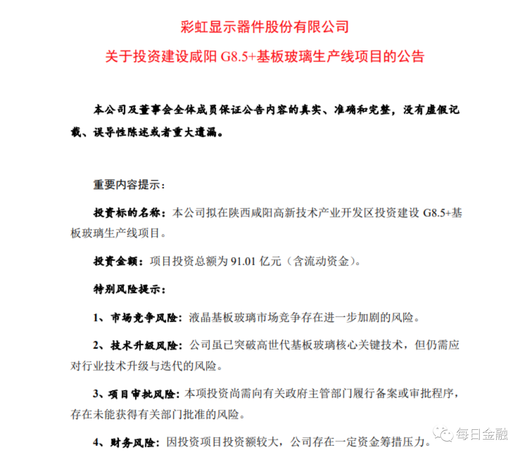 9月16日晚间,彩虹股份公告,拟在陕西咸阳高新技术产业开发区投资建设G8.5+基板玻璃生产线项目,主要建设内容包括建设8条热端窑炉和4条冷端生产线项目,投资总额为91.01亿元。本项目达产后,年产G8.5+基板玻璃约580万片。公司拟在咸阳高新区设立全资子公司,注册资本为1亿元,作为G8.5+基板玻璃生产线项目的建设主体。