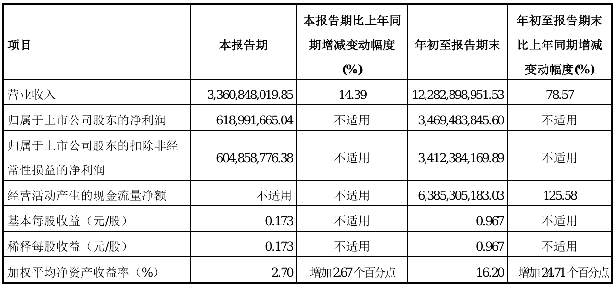 挖贝网10月28日,彩虹股份(600707)近日发布2021年前三季度报告,报告期内营业收入12,282,898,951.53元,同比增加78.57%;净利3,469,483,845.60元。