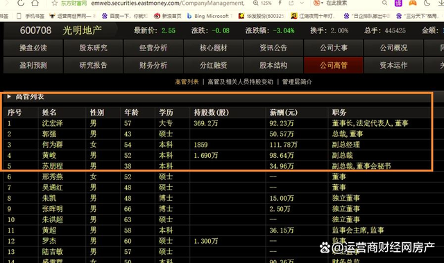 在上任光明地产总裁后,郭强也很少出现在媒体的镜头前。上市公司的公告显示,郭强2020年年度薪酬50.57万,可能是因为郭强是该年4月才来光明地产工作。