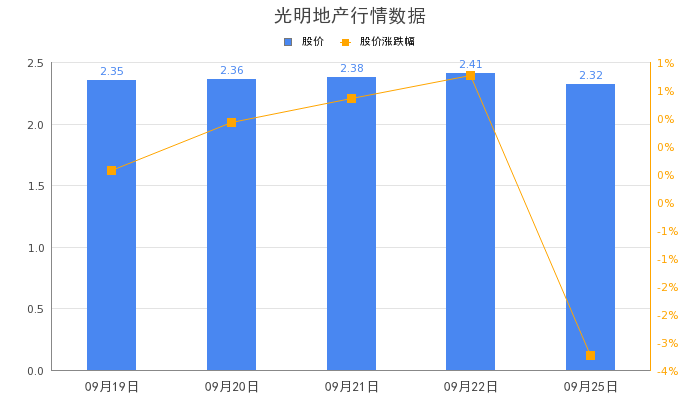 截至09月25日,光明地产(600708.SH)股价收盘2.41元,跌-3.73%,成交总额7,174.78万元,总市值51.70亿元。
