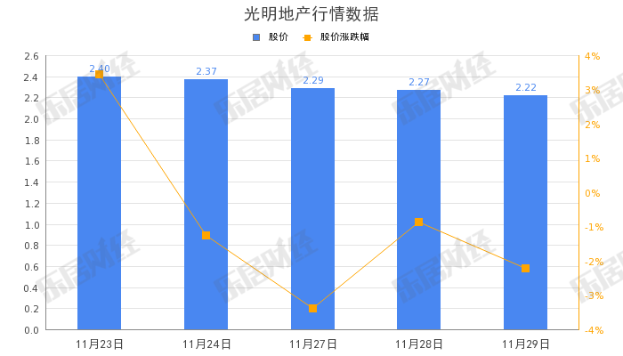 截至11月29日,光明地产(600708.SH)股价收盘报2.27元,跌2.2%,总市值49.48亿元。