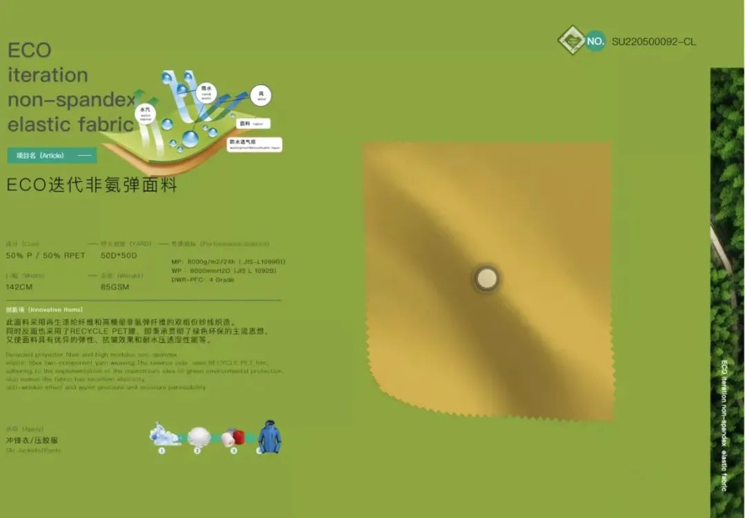“迭代非氨弹”:由再生纤维和高模量弹性纤维双组份环保纱线织造,绿色环保且具有抗皱、易打理、高弹性等性能的多功能材料。