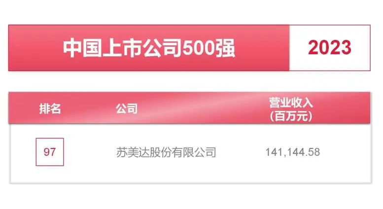 7月11日,财富中文网发布2023年《财富》中国上市公司500强排行榜,苏美达股份有限公司(证券代码:600710)以1411.45亿元的营业收入,位列第97位。