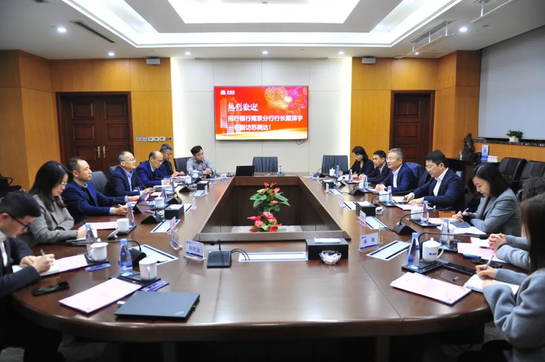 12月13日,招商银行南京分行党委书记、行长戴深宇一行到访苏美达股份有限公司(以下简称苏美达),苏美达党委书记、董事长杨永清接待戴深宇一行,党委委员、副总经理、财务总监、董秘王健参与座谈交流。