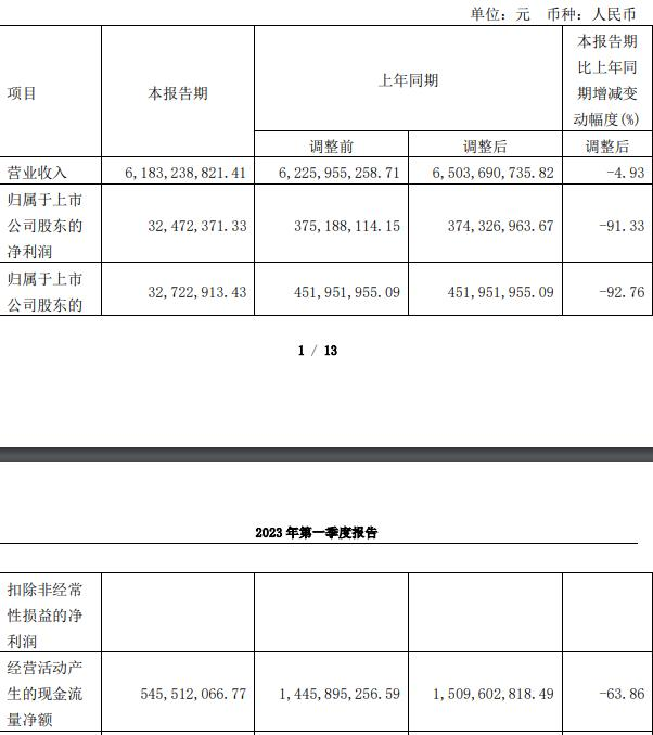 据盛屯矿业2023年一季度报告,报告期内,公司实现营业收入61.83亿元,同比减少4.93%;归属于上市公司股东的净利润3247.24万元,同比减少91.33%;归属于上市公司股东的扣除非经常性损益的净利润3272.29万元,同比减少92.76%;经营活动产生的现金流量净额5.46亿元,同比减少63.86%。