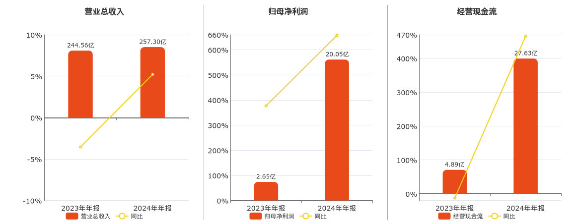公司营业总收入为257.30亿元。归母净利润为20.05亿元。经营活动现金净流入为27.63亿元。