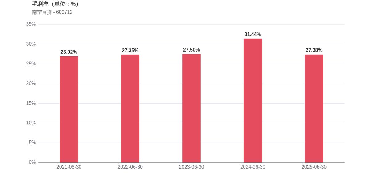 从反映盈利质量的指标来看,南宁百货净利率由2024年上半年的0.84%下滑至-4.77%,毛利率从31.44%下滑至27.38%,净资产收益率为-1.69%,各项盈利指标均出现不同程度的恶化。
