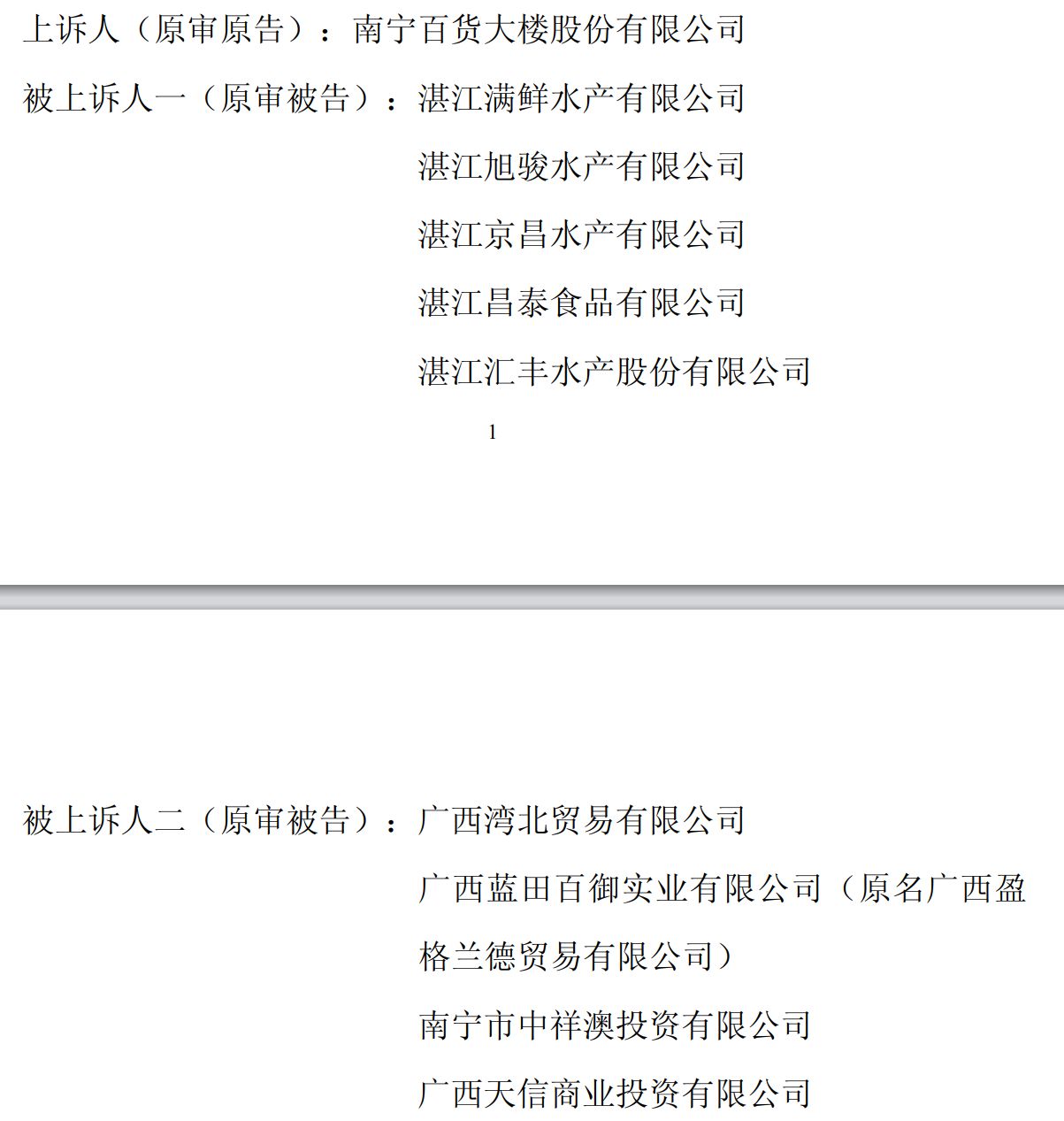 实际上,自2018年8月起,南宁百货便以买卖合同纠纷为由,起诉满鲜水产等5家公司,要求他们返还货款并支付违约金。之后,案件经一审、二审、重审一审、重审二审,南宁百货最终败诉。
