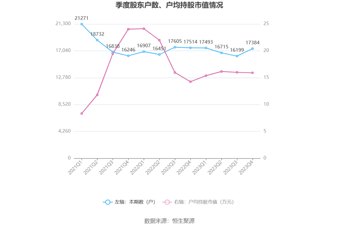 筹码集中度方面,截至2023年年末,公司股东总户数为1.74万户,较三季度末增长了1185户,增幅7.32%;户均持股市值由三季度末的15.99万元下降至15.91万元,降幅为0.50%。