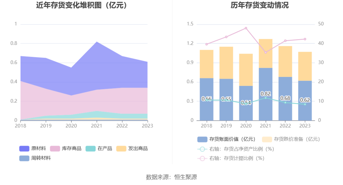 从存货变动来看,截至2023年末,公司存货账面价值为6191.28万元,占净资产的8.44%,较上年末减少576.25万元。其中,存货跌价准备为4534.78万元,计提比例为42.28%。