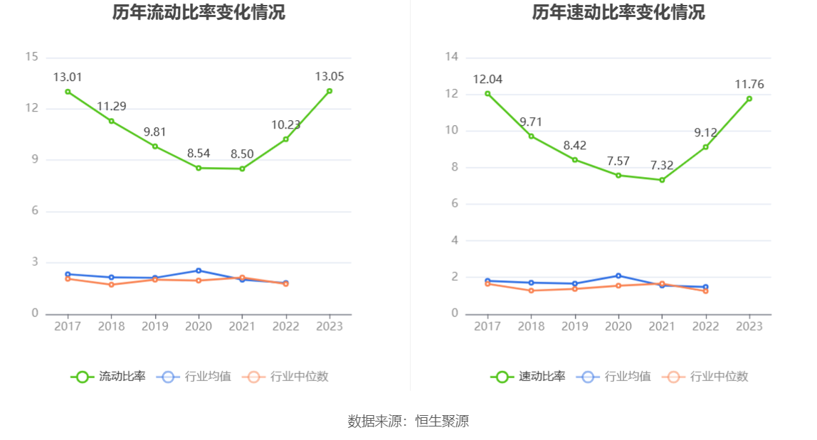 2023年,公司流动比率为13.05,速动比率为11.76。