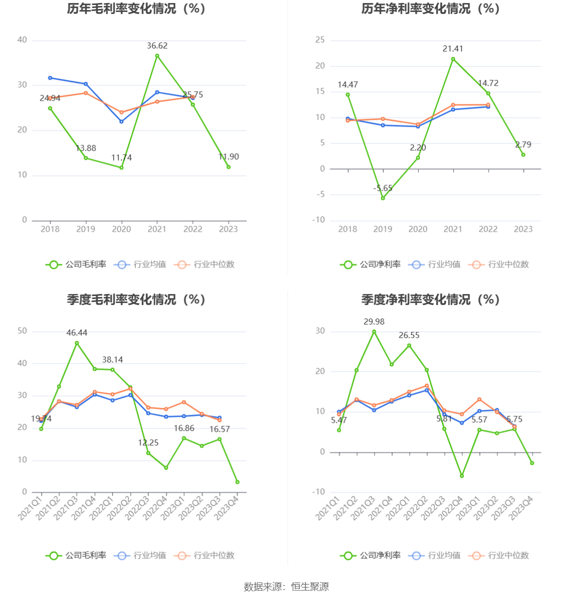 2023年,公司毛利率为11.90%,同比下降13.85个百分点;净利率为2.79%,较上年同期下降11.93个百分点。从单季度指标来看,2023年第四季度公司毛利率为3.23%,同比下降4.44个百分点,环比下降13.34个百分点;净利率为-2.68%,较上年同期上升3.21个百分点,较上一季度下降8.43个百分点。