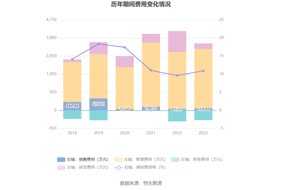2023年,公司期间费用为3005.11万元,较上年同期减少580.66万元;但期间费用率为10.94%,较上年同期上升1.30个百分点。其中,销售费用同比增长41.54%,管理费用同比增长4.0%,研发费用同比下降73.04%,财务费用由去年同期的-572.96万元变为-508.33万元。