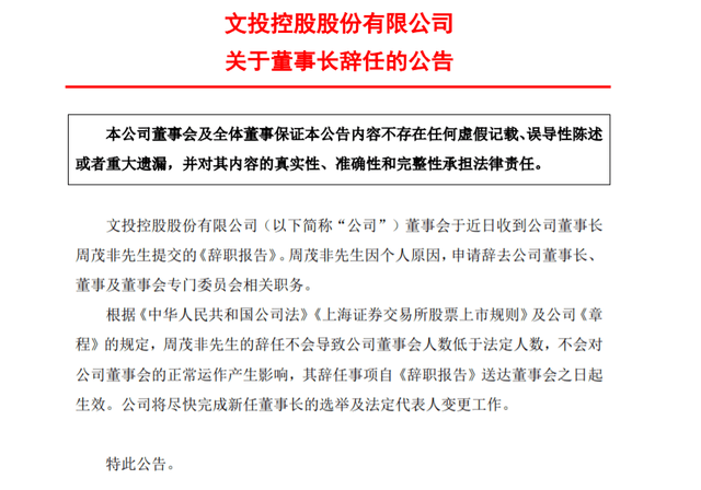 7月18日晚间,文投控股公告称,公司董事长周茂非提交的辞职报告。周茂非因个人原因,申请辞去公司董事长、董事及董事会专门委员会相关职务。