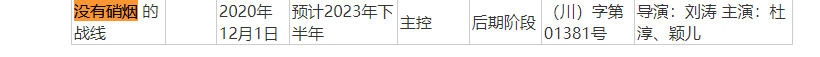 2020年12月,《没有硝烟的战线》在横店开机拍摄,当时曾称该剧计划在2021年制作完成,献礼建党100周年。文投控股2023年半年报披露,《没有硝烟的战线》由文投控股主控,预计在2023年发行上映。而截至目前,这部剧还没有上映消息。2月21日,文投控股方面在接受《每日经济新闻》记者采访时回复:“《没有硝烟的战线》目前还在后期调整中。”