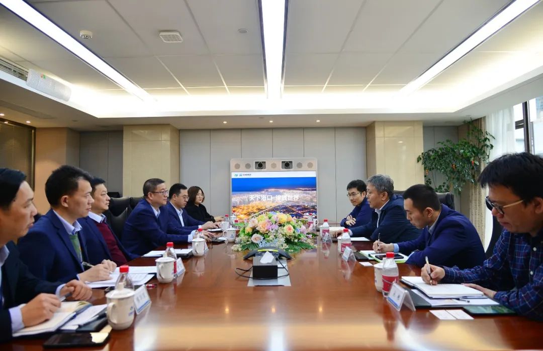 2022年2月17日下午,天津港股份有限公司总裁宋天威率队到访安通,安通控股股份有限公司董事长王维、董事总裁楼建强等公司管理层热情接待,双方就深耕港航协作、共谋一体发展进行深度交流座谈。