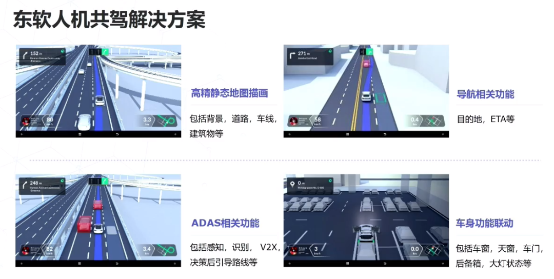 对此,我们提出了人机共驾驶解决方案,将四部分内容平衡整合在一起,给用户一个统一的出口。一是高精静态地图描画,包括背景、道路、车线、建筑物等;二是导航相关功能,包括目的地、ETA等;三是ADAS相关功能,包括感知、识别、V2X、决策后引导路线等;四是车身功能联动,包括车窗、天窗、车门、后备箱、大灯状态等。用户通过一个应用就可以了解到所有信息,达到安全驾驶的目的。