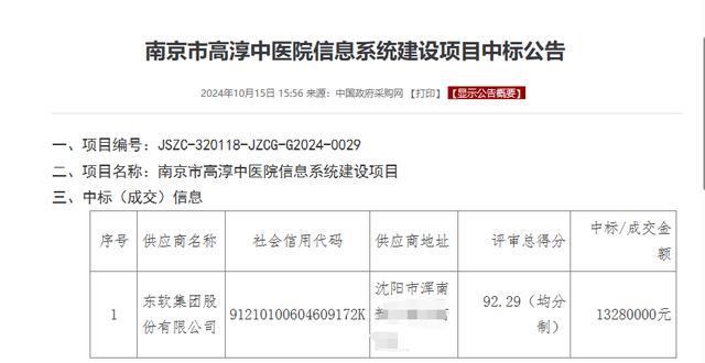 项目进展很快,不到一个月的时间,项目中标结果公布,东软集团以1328万元的报价成功中标。
