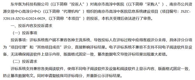 根据政府采购供应商投诉处理决定书-高财诉决〔2024〕1号,东华医为投诉项目采购方,称:评标系统客户端不兼容各种主流系统,导致投标人在评标过程中应得客观评分未得,直接影响评标结果。