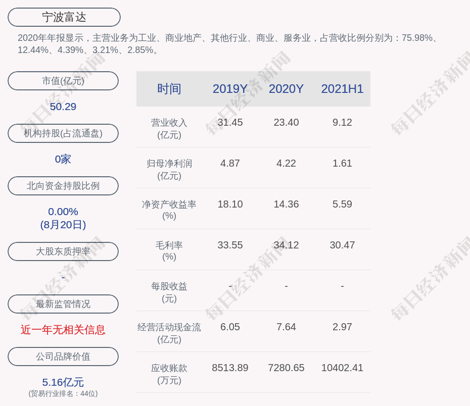 2020年年报显示,宁波富达的主营业务为工业、商业地产、其他行业、商业、服务业,占营收比例分别为:75.98%、12.44%、4.39%、3.21%、2.85%。
